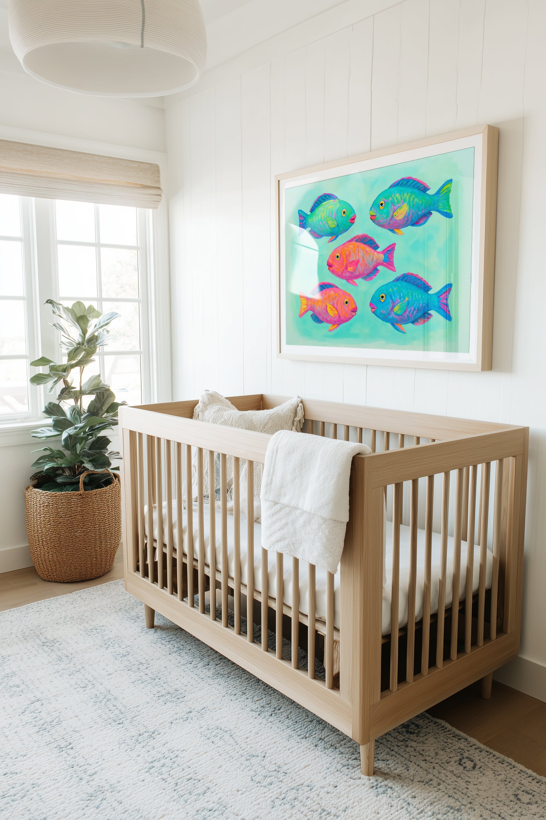 Bright, playful, and full of coastal charm, this vibrant framed art print features a lively school of colorful parrotfish painted in bold tropical hues. The rich aqua background and neon blues, pinks, greens, and oranges create a joyful underwater scene that instantly energizes any space. Printed on premium archival paper and professionally framed for long-lasting quality, this piece is perfect for coastal homes, beach-themed nurseries, or anyone searching for tropical wall art, ocean-inspired décor, or unique marine-life artwork. A cheerful, gallery-worthy statement that brings the magic of the reef to your walls.